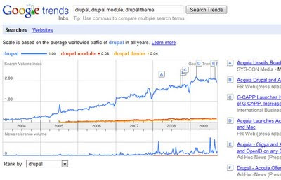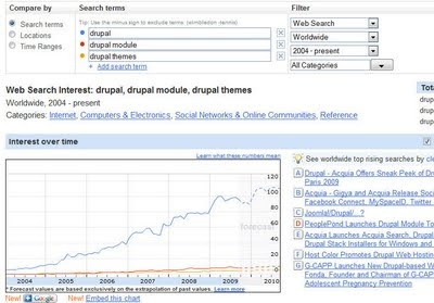 With Drupal 7 code freeze already happened and we waiting for the best Drupal release ever Drupal has gained popularity than ever. Below are some of the statistics I got from Google Insights: The chart shows Drupal's search popularity in Google in past 90 days.