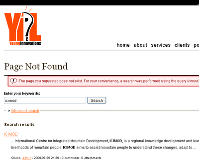 If someone types a wrong URL on the website, it will not just show the page not found but will run a search with the parameter provided in the URL. For example if anyone does: ICIMOD - the URL is not valid but what Search 404 will do it run a search with word icimod on the YIPL's website and fetch a result as below, this will make the website more user friendly: